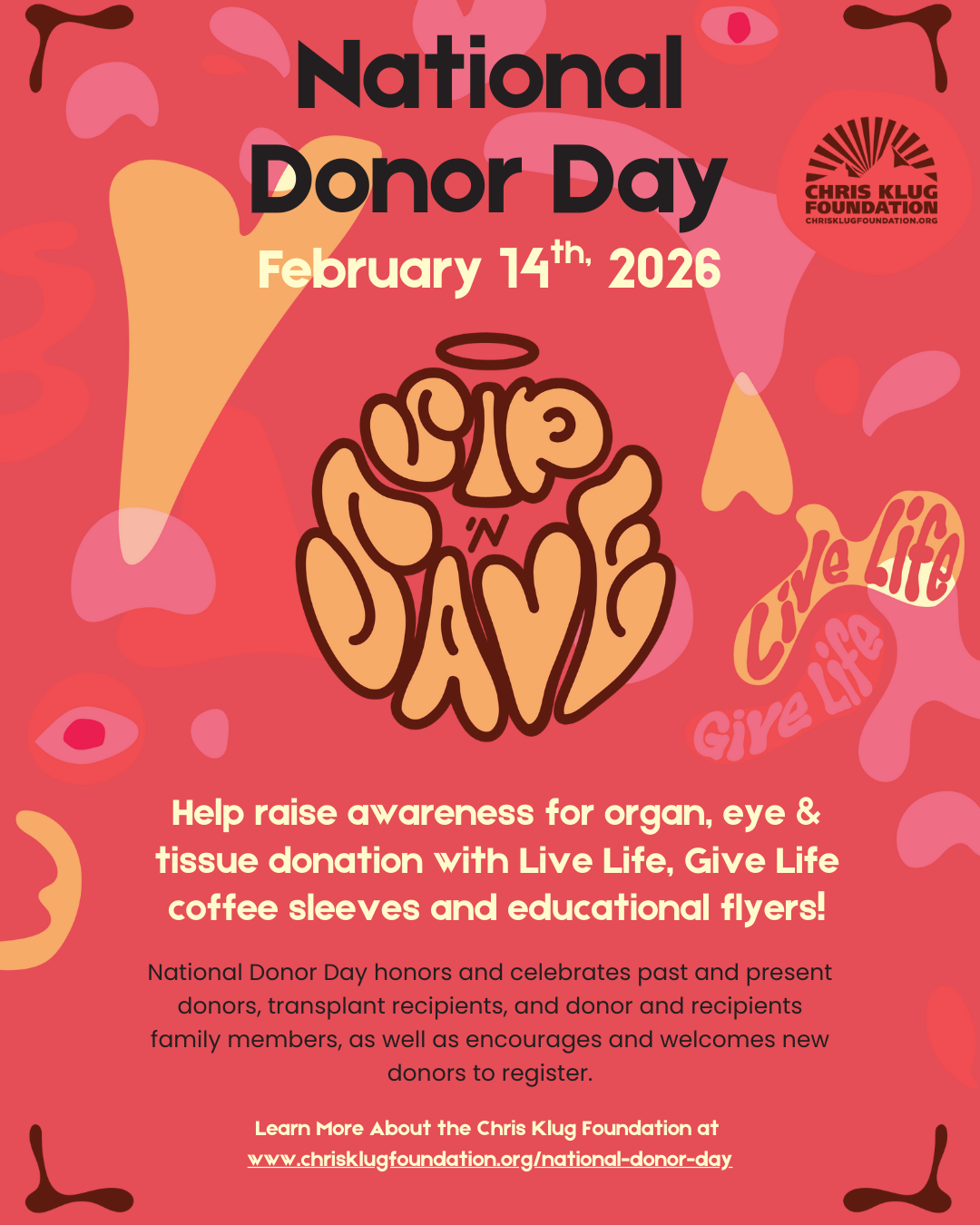 CKF will send free coffee sleeves, coasters, stickers, flyers, and posters for shops to use on February 14th in honor of National Donor Day.