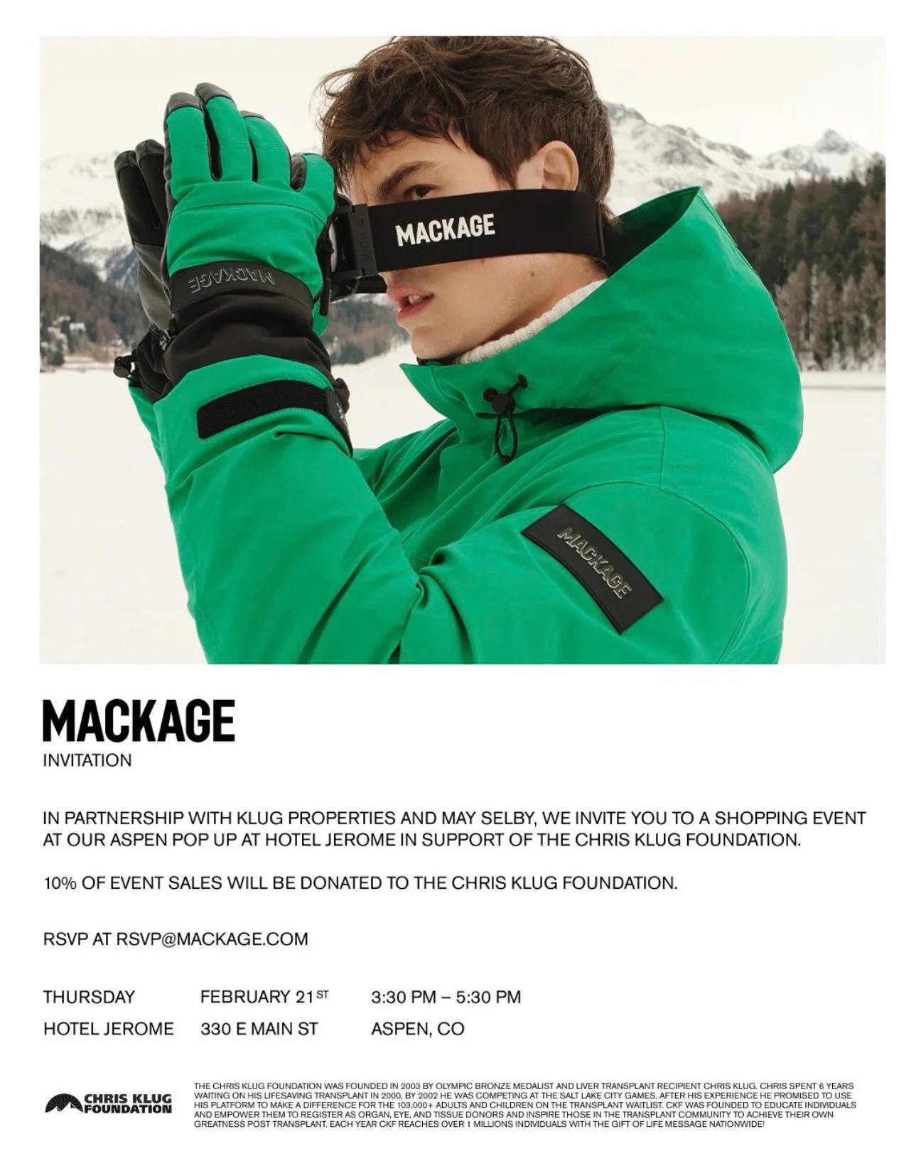 Join CKF for Mackage’s Pop Up Event at the Jerome Hotel on Saturday, February 21st from 3:30 pm - 5:30 pm. CKF will received 10% of all sales to support our work raising awareness for organ, eye, and tissue donation.