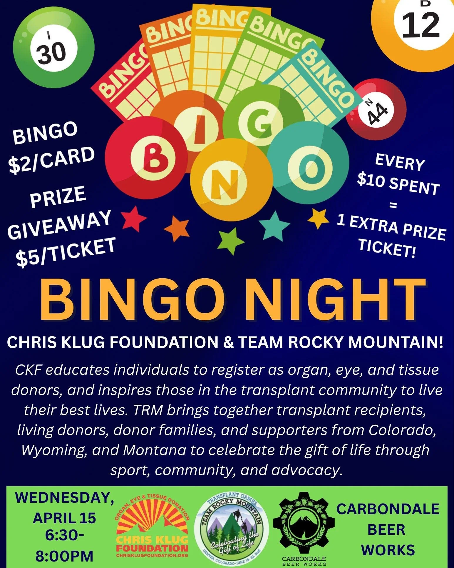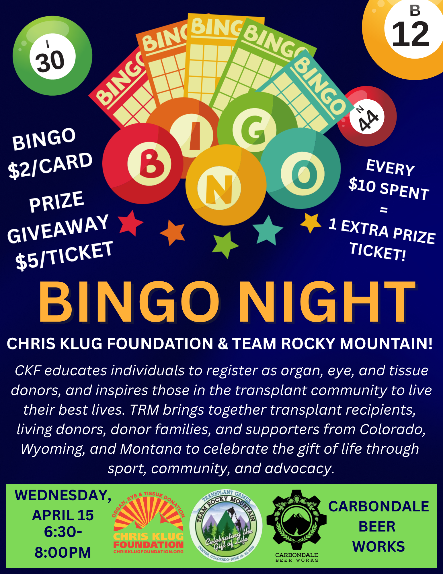 Join CKF and Team Rocky Mountain at Carbondale Beerworks on April 15th at 6:30 pm for a fun evening of bingo and celebration.