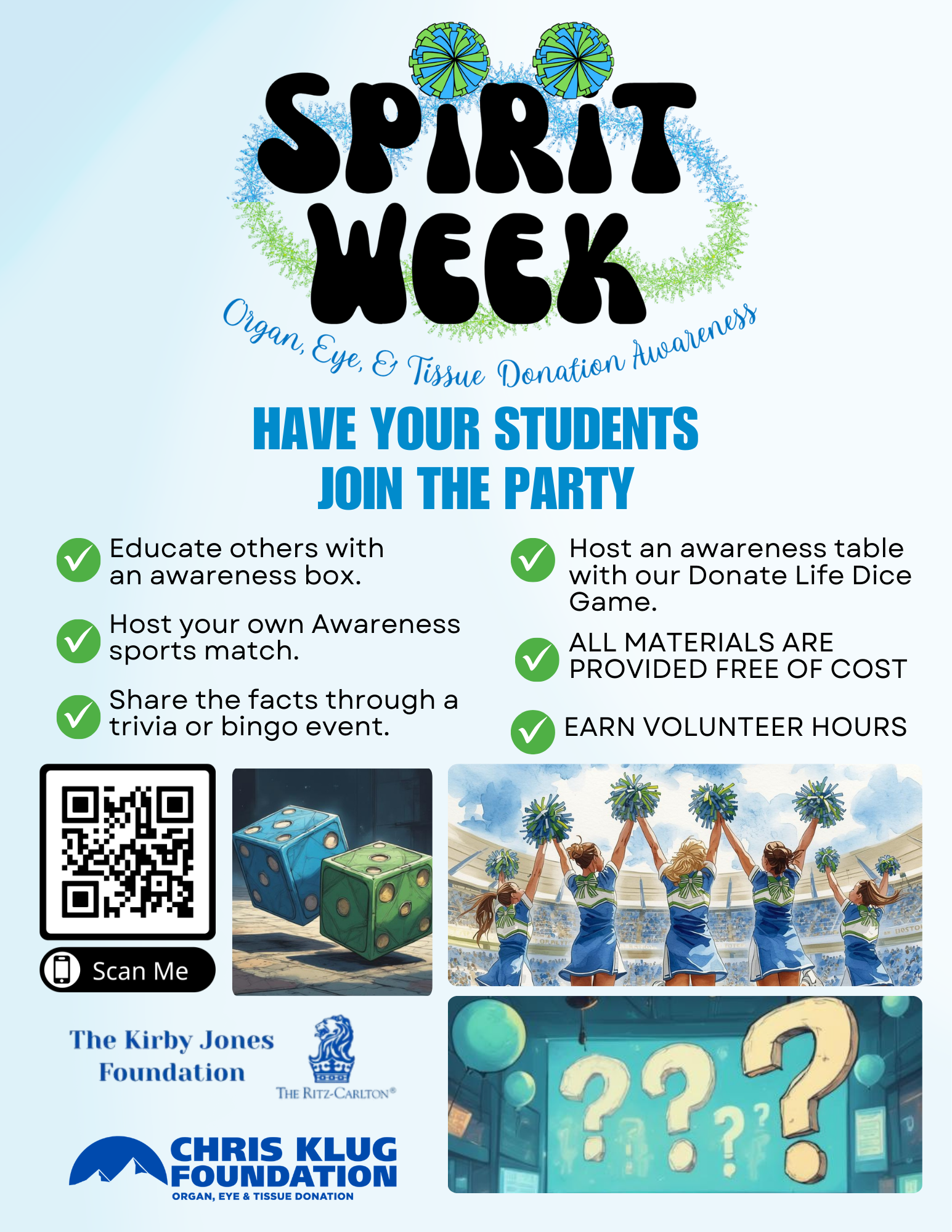 Join CKF as we celebrate Donate Life Month with our Spirit Week. We will support the Donate Life Spirit Week by offering students the chance to host their own spirit week at their school or in their community. CKF will provide participants with our Donate Life Dice to host an awareness booth and educate others. Students will also have the option to add a sports match, in which CKF will send green gear (laces, socks, cheer bows) and announcer notes, or a trivia/bingo event, where CKF will provide the materials needed.